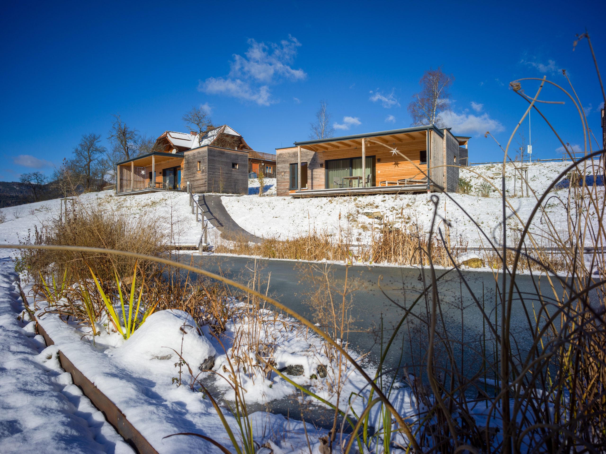 Von deiner Terrasse aus, die nach Süden gerichtet ist, genießt du den Blick auf den Wald und den Naturteich, in dem du in der warmen Jahreszeit ein paar Schwimmtempi machen oder dich erfrischen kannst.